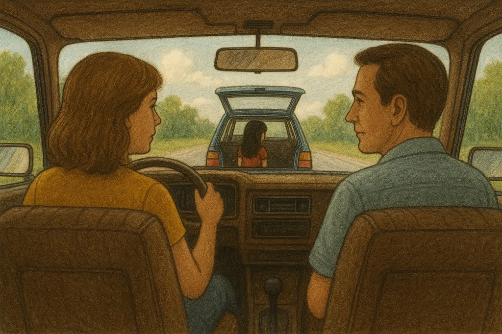 “Look at that. She is holding that open.” Mom’s voice snaps me out of my daydreams. I lean over, looking between Mom and Dad out the windshield. A yellow hatchback in front of us, a young girl, my age, behind the back seat, holding the hatch open.